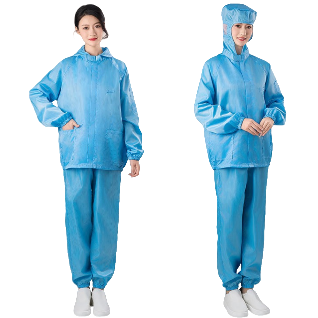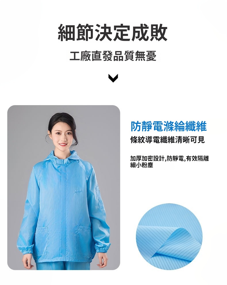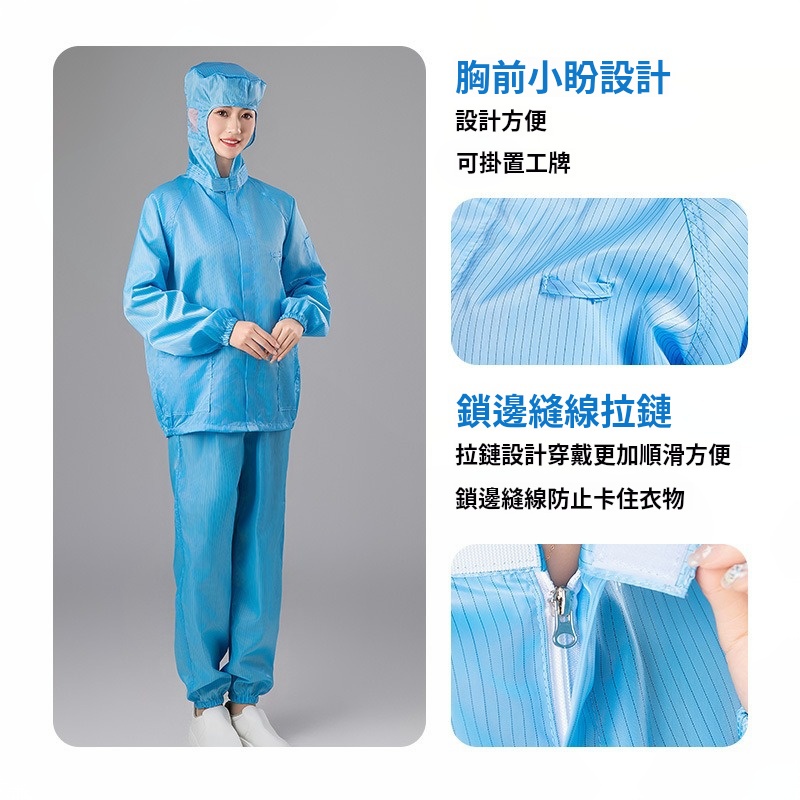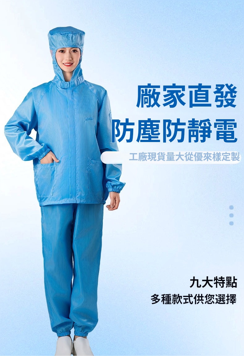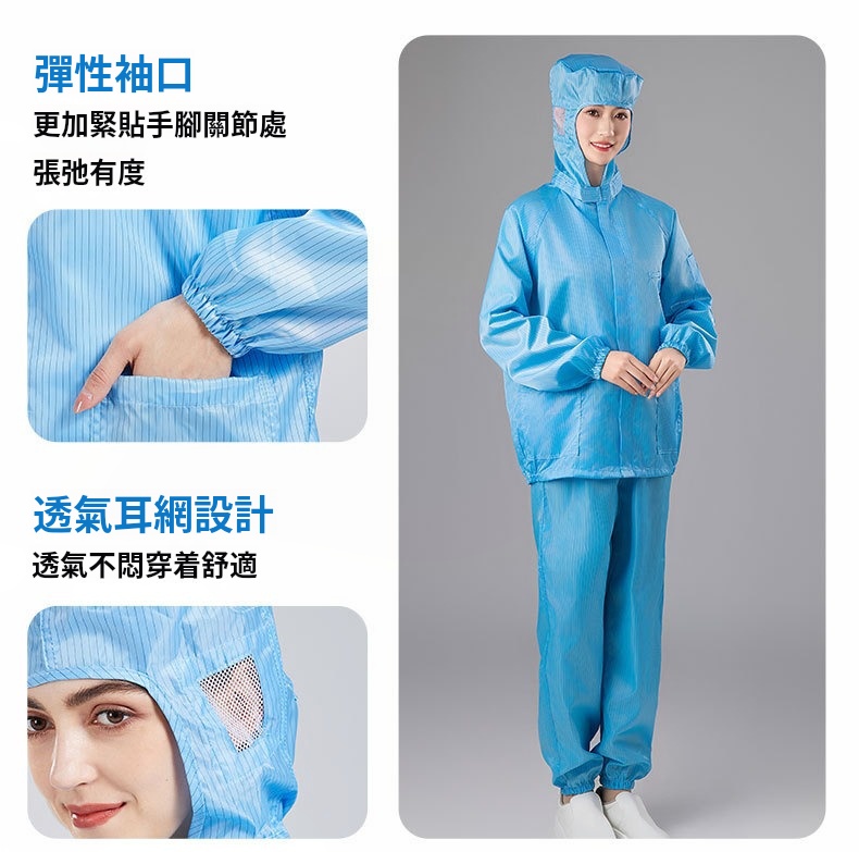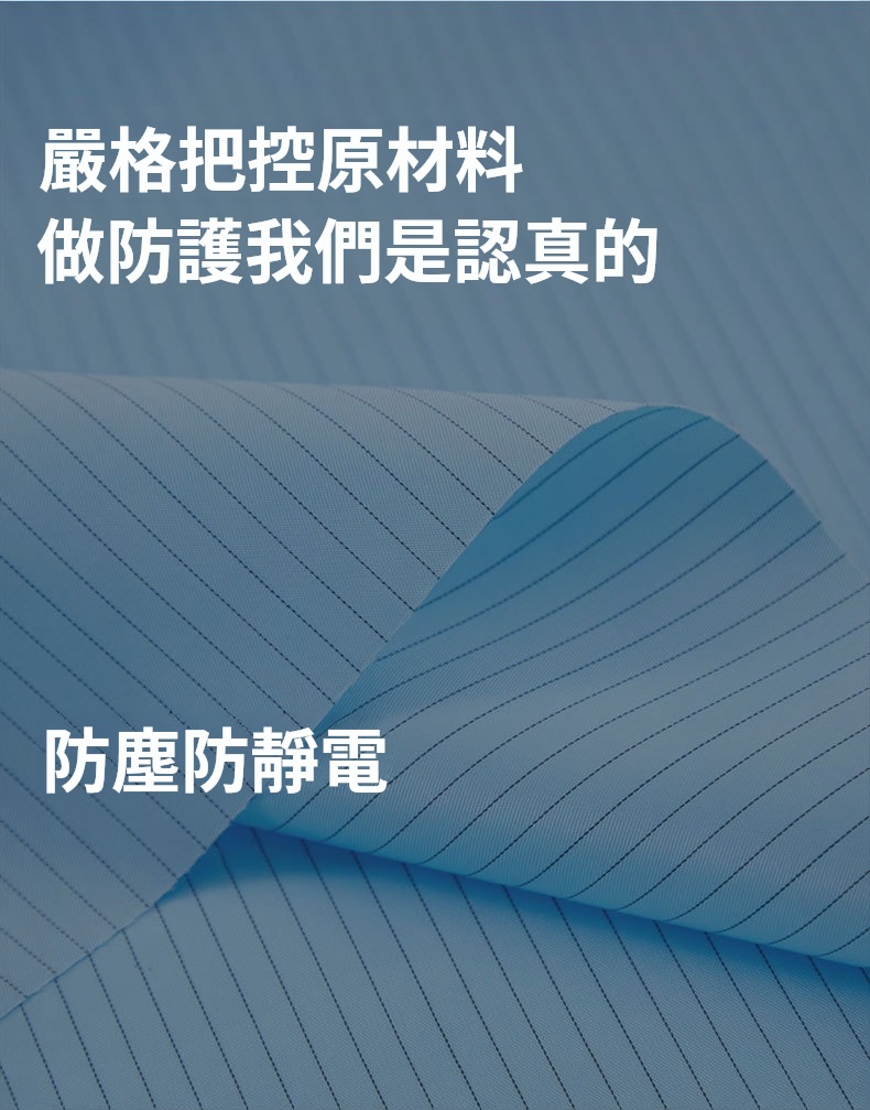 2.根據無塵室級別需求提供多款式選擇,袖口與褲管採雙層結構設計,內層嵌織導電纖維,高效防塵、防靜電。