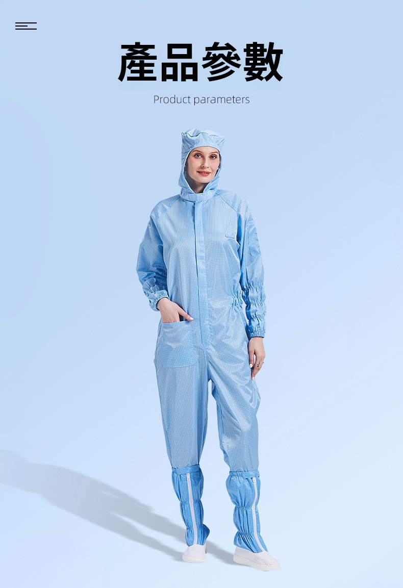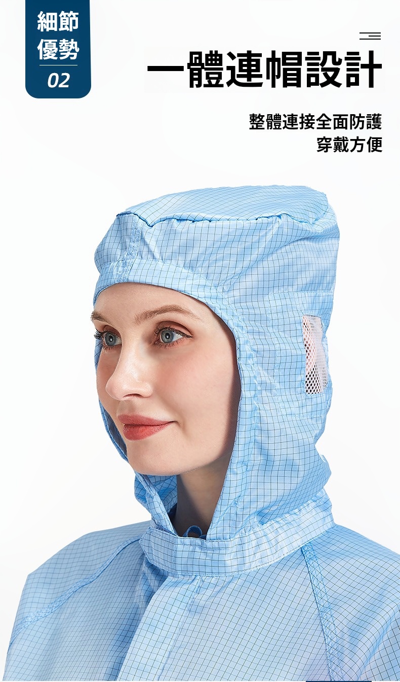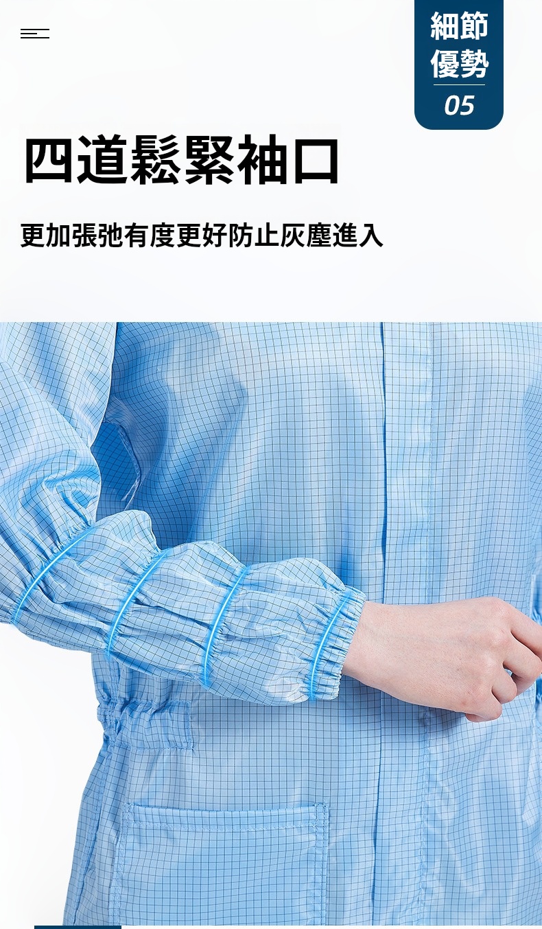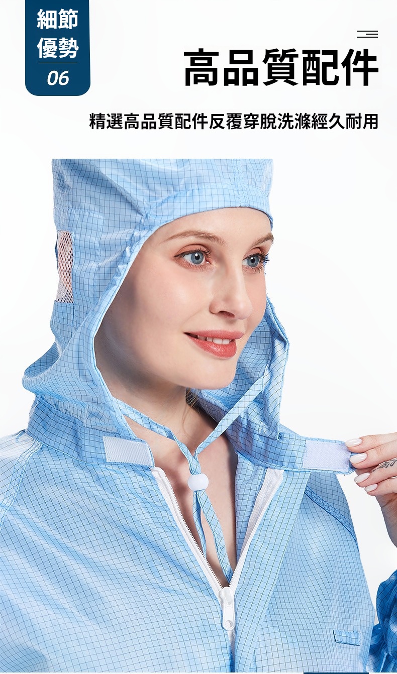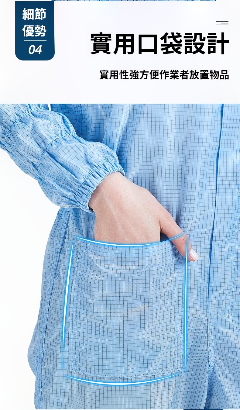 2.根據無塵室級別需求提供多款式選擇,袖口與褲管採雙層結構設計,內層嵌織導電纖維,高效防塵、防靜電。