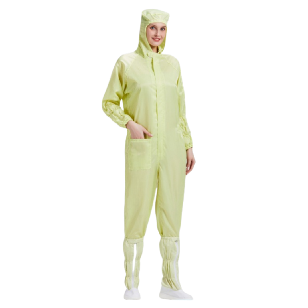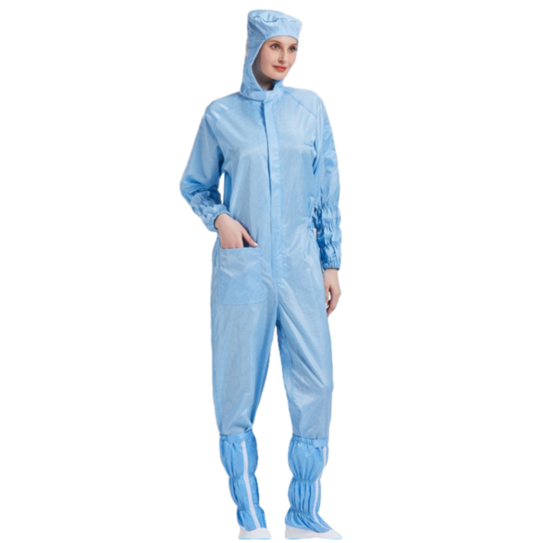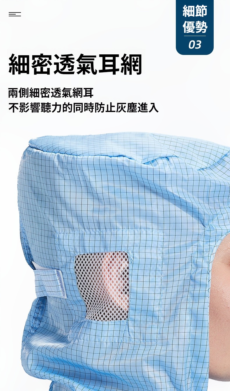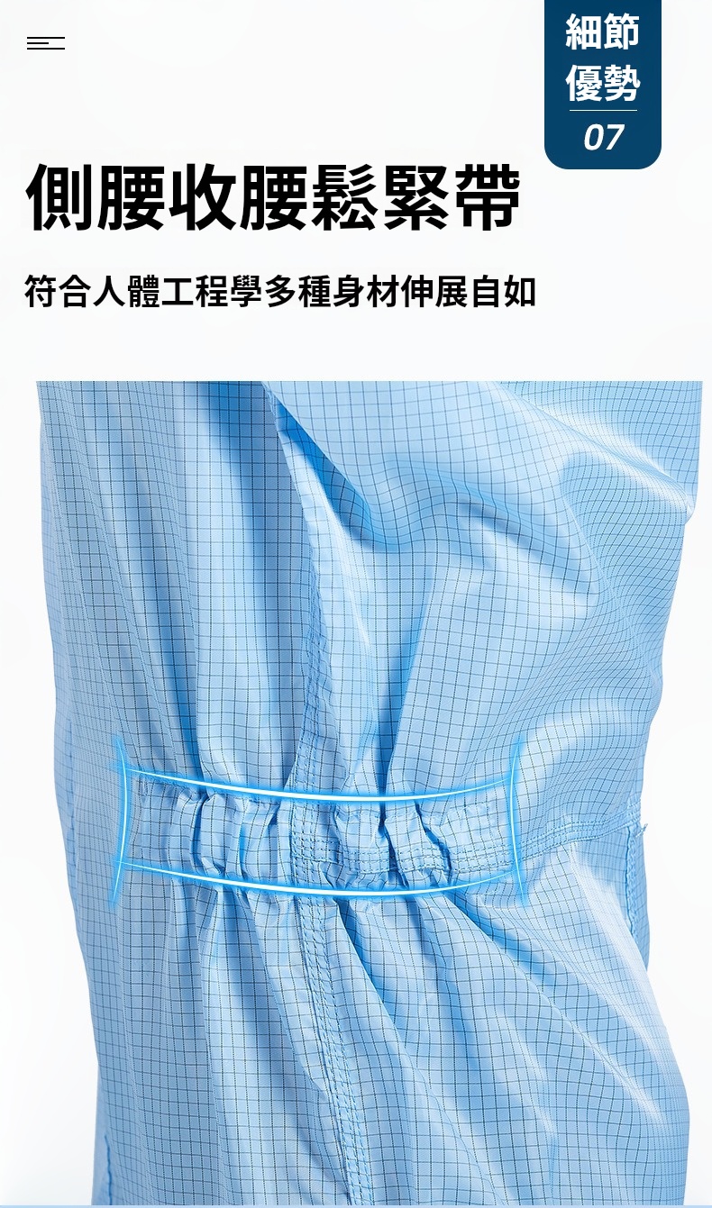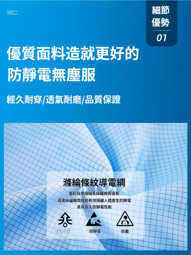 2.根據無塵室級別需求提供多款式選擇,袖口與褲管採雙層結構設計,內層嵌織導電纖維,高效防塵、防靜電。